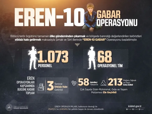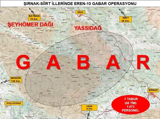 Bölücü terör örgütünü ülke gündeminden tamamen çıkarmak ve bölgede barındığı değerlendirilen teröristleri etkisiz hale getirmek maksadıyla Şırnak ve Siirt illerinde "EREN-10 GABAR" Operasyonu başlatıldı.