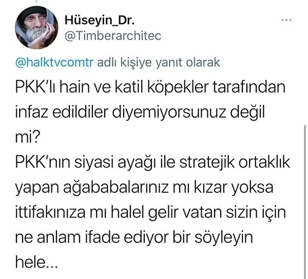 Dr. Hüseyin, HALK TV'ye "PKK'lı hain ve katil köpekler tarafından infaz edildiler diyemiyorsunuz değil mi? PKK'nın siyasi ayağı ile stratejik ortaklık yapan ağababalarınız mı kızar yoksa ittifakınıza mı halel gelir vatan sizin için ne anlam ifade ediyor bir söyleyin hele..." dedi.