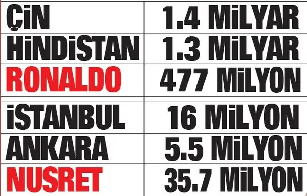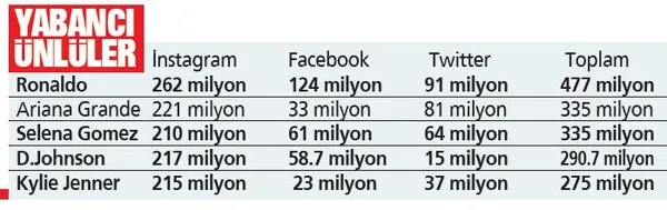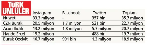 Sosyal medyada ünlüleri takip etme çılgınlığı zirve yaptı. Facebook, Twitter ve Instagram'da boy gösterenlerin her hareketini merak edenlerin sayısının dünyadaki birçok ülke nüfusundan fazla olduğu ortaya çıktı. Yeşil sahaların bir numarası Cristiano Ronaldo, sosyal medyada da birinciliği kimseye kaptırmadı. ABD'de ve Dubai'de de et restoran şubeleri bulunan Nusret Gökçe, Türkiye'de sosyal medya liderliğini kimseye bırakmıyor.