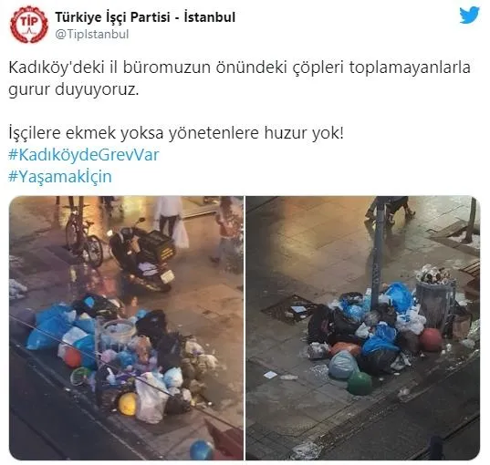 CHP'li Kadıköy Belediyesi'nde işçilerin belediye yönetimiyle toplu iş sözleşmesi görüşmelerinin çıkmaza girmesinin ardından çöpler sokaklarda kaldı. İşçi Partisi greve giden işçilere tam destek verip günlerdir biriken çöplerden kareler paylaşarak "Kadıköy'deki il büromuzun önündeki çöpleri toplamayanlarla gurur duyuyoruz. İşçilere ekmek yoksa yönetenlere huzur yok!" mesajını verdi. Öte yandan toplanmayan çöpler halkın kabusu oldu.
