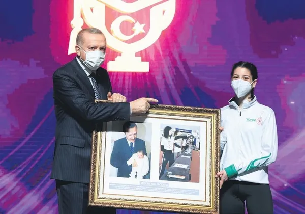 Başkan Erdoğan törende öğrencilere hediye verdi. Onlardan biri de 2003'te Rize'de açılışını yaptığı hastanede açılış günü doğan ve birlikte fotoğraf çektirdiği pentatlon sporcusu Selen Gülel'di...