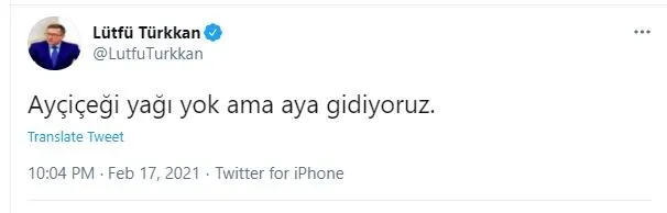 Türkiye'nin tarihi projelerinden olan "Uzay Programı"nı küçümsemeye çalışan İYİ Partili Lütfü Türkkan rezil olmuştu. Sosyal medya hesabından "Yağ yok ama aya gidiyoruz" paylaşımında bulunan Türkkan'ın, 20 dönümlük arazide kurulu yağ fabrikası olduğu ortaya çıkmıştı.