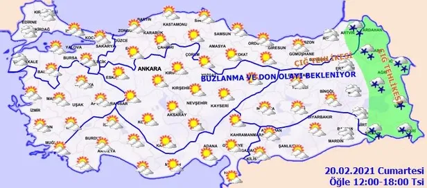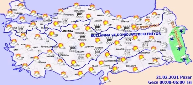 Meteoroloji Genel Müdürlüğü tarafından yapılan son değerlendirmelere göre; ülkemiz genelinin doğu kesimleri çok bulutlu, Doğu Anadolu'nun doğusu ile Kayseri, Rize, Artvin ve Siirt çevrelerinin karla karışık yağmur ve kar yağışlı, d.ğer yerlerin parçalı ve az bulutlu geçeceği tahmin ediliyor. İç ve doğu kesimlerde buzlanma ve don olayı ile birlikte batı bölgelerde yer yer pus ve sis hadisesi bekleniyor. Doğu Karadeniz'in iç kesimleri ile Doğu Anadolu'nun güneydoğusunda çığ oluşma tehlikesi bulunmaktadır.