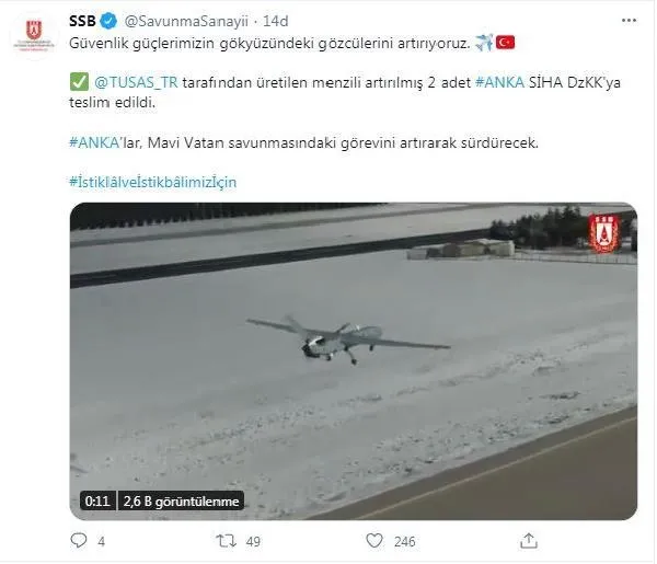 Türk Havacılık ve Uzay Sanayi tarafından üretilen menzili artırılmış 2 ANKA SİHA, Deniz Kuvvetleri Komutanlığı'na teslim edildi. ANKA'lar, Mavi Vatan savunmasındaki görevini artırarak sürdürecek" denildi.