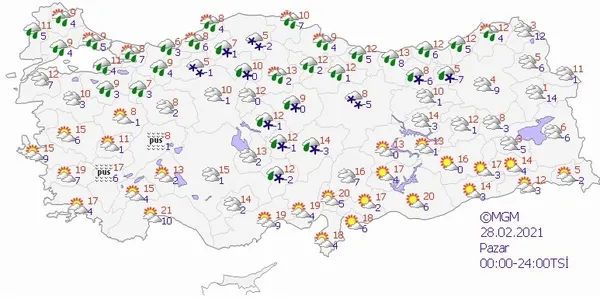 Şubat ayına Trakya'dan Rize'ye kadar ülkenin kuzeyinin sağanak yağışlara teslim olduğu bir günle veda edeceğiz. İstanbul başta olmak üzere Marmara Bölgesi'nin büyük bölümü Batı, Orta ve Doğu Karadeniz'in tamamında sağanak yağış hakim olacak. Yağışlar Gümüşhane, Bayburt, Bolu, Karabük, Kastamonu, Çankırı, Yozgat, Sivas, Kayseri, Kırşehir ve Nevşehir'de karla karışık yağmur ve kara dönüşecek. Doğu Anadolu'da ve İç Anadolu'nun yağış almayan bölgelerinde bulutlu bir hava hakim olurken, Ege, Akdeniz ve Güneydoğu Anadolu'nan tamamında parçalı bulutlu ve güneşli bir gün yaşanacak.