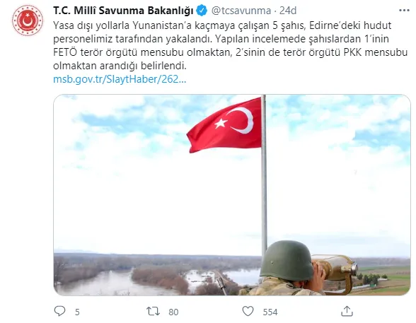 Son dakika haberleri... MSB'den yapılan açıklamada "Yasa dışı yollarla Yunanistan’a kaçmaya çalışan 1'i FETÖ, 2'si PKK terör örgütü üyesi 5 kişi Edirne’deki hudut personelimiz tarafından yakalandı." denildi.