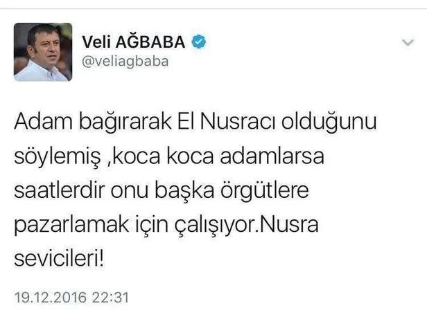 CHP Genel Başkan Yardımcısı Veli Ağbaba, FETÖ'yü aklamak için sosyal medyadaki skandal paylaşımlarıyla da tartışılmıştı. FETÖ'nün cinayetlerinden biri olduğu artık ortaya çıkan Rusya'nın Ankara Büyükelçisi Andrey Karlov'un öldürülmesinde de, CHP'liler ısrarla "Katil El Nusra'cı" diye algı operasyonu yapmış, hedefi FETÖ'den uzaklaştırmak için çaba göstermişlerdi. Bu isimlerin başında da Kemal Kılıçdaroğlu'nun yardımcısı Veli Ağbaba gelimişti. "Adam bağırarak El Nusracı olduğunu söylemiş, koca koca adamlarsa saatlerdir onu başka örgütlere pazarlamak için çalışıyor. Nusra sevicileri!" paylaşımı yapan Ağbaba, FETÖ'yü aklamaya çalışmıştı.