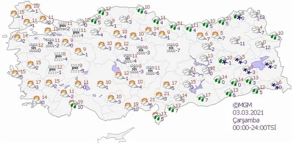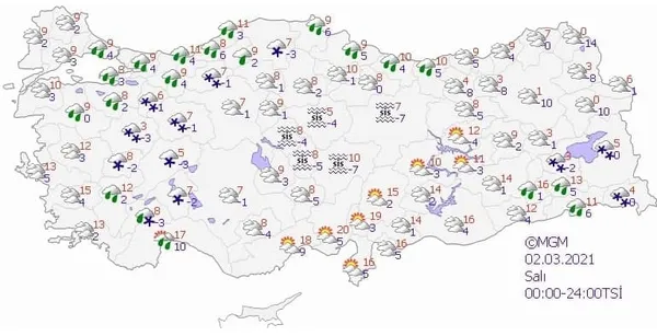 Kar yağışı yerini kısa sürede parçalı bulutlu ve güneşli havaya bırakacak. Kar yağışı yurdun Doğu kesiminde devam edecek. Karadeniz'de yağmurlar devam ederken, Akdeniz ve Ege'de hava sıcaklıkları mevsim normallerinin üzerinde seyredecek.