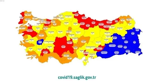 İllerin risk durumu, renklere göre sınıflandırıldı. Buna göre, mavi gruptaki renkler düşük riskli, sarı gruptaki şehirler orta riskli, turuncu gruptaki renkler yüksek renkli ve kırmızı gruptaki iller yüksek riskli renk kodu ile sınıflandırıldı.