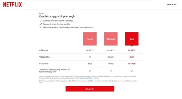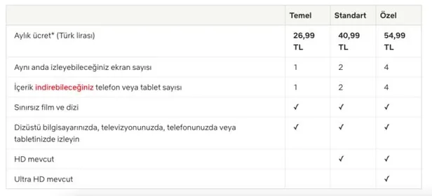 Nettlix sözcüsünden yapılan yazılı açıklamada, "4 Mart'tan itibaren hayata geçireceğimiz aylık ücretlerimizi şöyle şekillendirdik: Temel plan 26,99 TL, Standart plan 40,99 TL, Özel plan ise 54,99 TL. Her zaman olduğu gibi üyelerimiz kendileri için en uygun seçeneği sunduğumuz bu üç plan arasından tercih edebilecek" denildi.