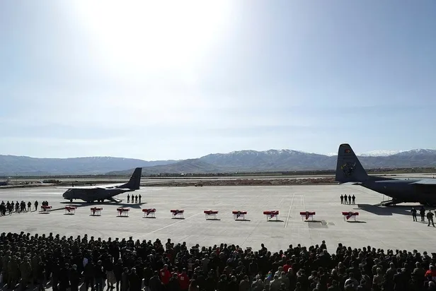 Son dakika haberi... Bitlis'te meydana gelen helikopter kazasında şehit olan 11 asker için Ankara'da devlet töreni düzenlendi. Devlet erkanının hazır bulunduğu cenaze törenine Başkan Erdoğan da katıldı. Törende konuşan Başkan Erdoğan, "Biz bir şeye inanıyoruz. "Allah yolunda öldürülenlere ölüler demeyiniz" ayeti. Şimdi biz diri olan bu şehitlerimizle inşaAllah sevgili habibinin sancağı altında da bir oluruz. Temennimiz budur. Tabi tüm ailelere, ordumuza, milletimize sabırlar diliyorum." dedi. Şehit askerlerin naaşları, defnedilmek üzere memleketlerine uğurlandı.