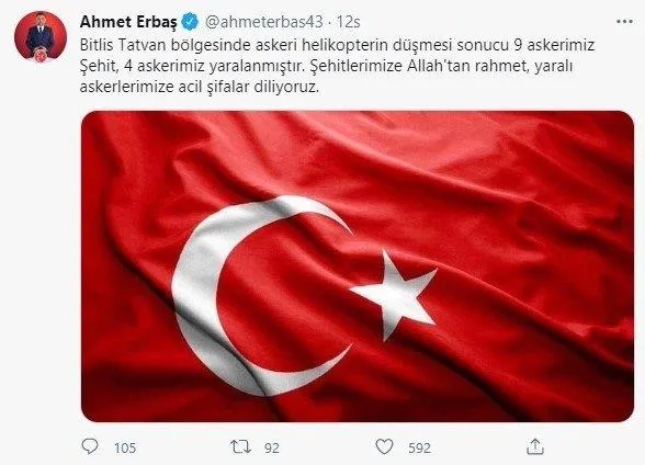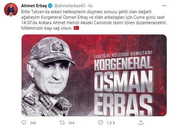 Son dakika haberi! MHP Kütahya Milletvekili Ahmet Erbaş'ın 11 şehidimizin olduğu Bitlis'te düşen askeri helikopter ile ilgili sosyal medya hesabı Twitter'dan yaptığı paylaşım yürekleri burktu. MHP Kütahya Milletvekili Ahmet Erbaş paylaşımı yaptığı sırada 11 şehidimizin arasında amcasının oğlu 8. Kolordu Komutanı Korgeneral Osman Erbaş'ın da bulunduğundan habersizdi.
