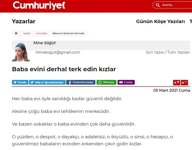 Başkan Erdoğan'dan Cumhuriyet yazarı Mine Söğüt'ün "Baba evini derhal terk edin kızlar" şeklindeki çağrısına tepki