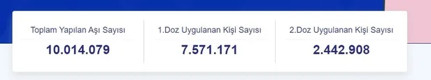 Sağlık Bakanlığı Covid-19 bilgilendirme platformunda yer alan verilere göre; Türkiye'de Covid-19'la mücadele kapsamında birinci ve ikinci doz aşı olanların toplam sayısı 10 milyonu geçti.