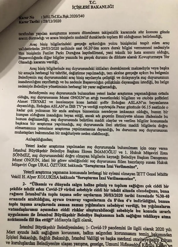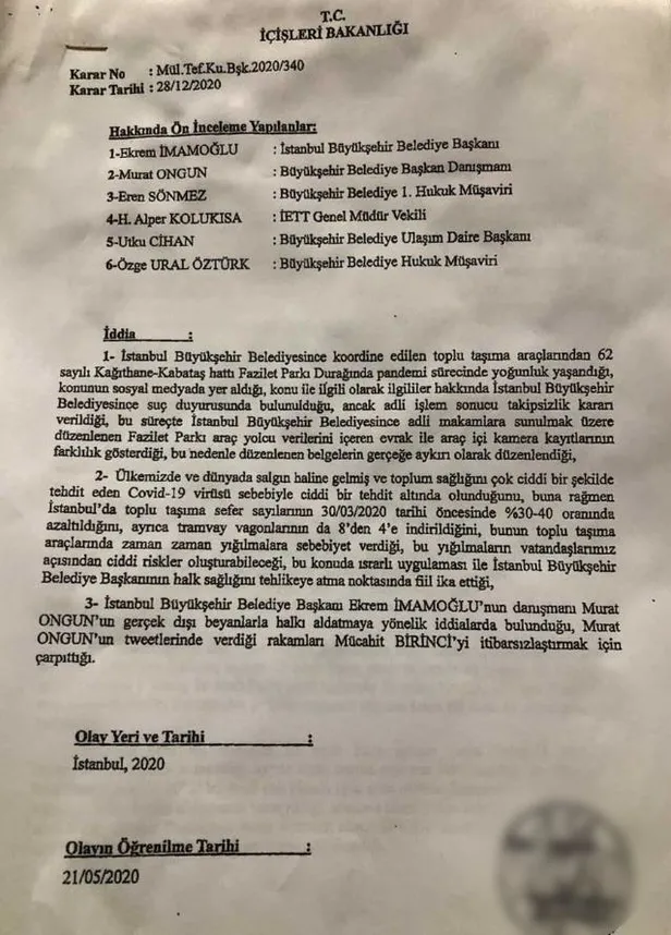 İBB Hukuk Müşavirliği de başsavcılığa Fazilet durağından bir seferde 71 kişinin bindiğini gösteren sahte evrak düzenledi. Soylu; pandemi döneminin en büyük yalanına imza atan ve sahte evrak düzenleyerek başsavcılığı yanıltmaya çalışan İBB Başkanı Ekrem İmamoğlu, İBB 1. Hukuk Müşaviri Eren Sönmez, İBB Başkan Danışmanı Murat Ongun ve İBB Hukuk Müşaviri Özge Vural Öztürk'e soruşturma izni verilmesine karar verdi.