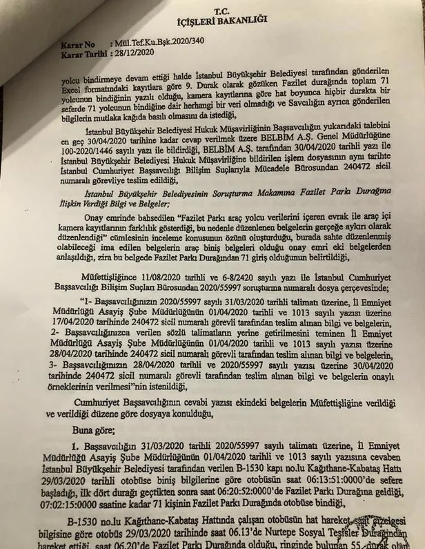 Fazilet durağından hiç yolcu binmemesine rağmen 47 yolcunun bindiği iddiasında bulunan İBB'nin yalanının ortaya çıkmasını engellemek için sahte evrak düzenlemesi, İçişleri Bakanlığı'nın soruşturma izniyle ispatlandı.