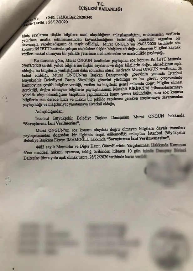 Karara göre; Ongun tarafından paylaşılan iki İETT hattında 29 Mart 2020 tarihli yolcu bilgilerine ilişkin sayıların ve diğer bilgilerin doğru olmadığı açık. Bu bilgilerin yanlışlığı daha sonra ulusal medyada Ongun tarafından da kabul edildi. Ongun, başkan danışmanı ve İBB Basın Sözcüsü.