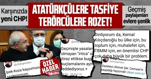 PKK’nın siyasi kanadı ve dolayısıyla PKK ile alenen ittifaka giren CHP, partideki Atatürkçüleri tasfiye ederken bir diğer terör örgütü FETÖ’yü savunan kişileri de partisine transfer etmeye devam ediyor. Son olarak Cihangir İslam’a CHP rozetinin takılması parti içinde isyana neden oldu. Atatürk ilkelerinden uzaklaşıldığı eleştirisinde bulunan CHP’li vekiller, son dönemde yaşanan istifalara dikkat çekerek, tepkilerinin dikkate alınmasını istedi.