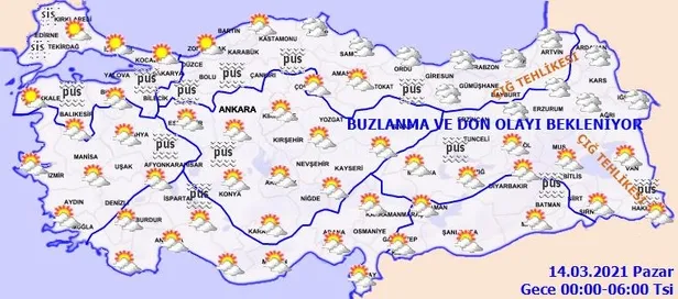 Meteoroloji Genel Müdürlüğü tarafından yapılan son değerlendirmelere göre, ülkemiz genelinin parçalı ve az bulutlu, zamanla kuzey kesimlerinin yer yer çok bulutlu geçeceği tahmin ediliyor. Sabah ve gece saatlerinde Marmara'nın güney ve batısı ile iç ve doğu kesimlerde pus ve yer yer sis hadisesi ile birlikte buzlanma ve don olayı bekleniyor. Doğu Karadeniz'in iç kesimleri ile Doğu Anadolu'nun güneydoğusunda çığ oluşma riski bulunmaktadır.