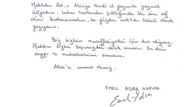 Sevgili Peygamberimizin buyurduğu gibi, insana şükretmeyen, Allah'a edemez. Mektubu kendi elyazımla yazmak istiyordum, fakat hastaneden çıktığımda bir müddet sağ elimi kullanamadım. Bu yüzden bu mektubu tehirli olarak yazıyorum."