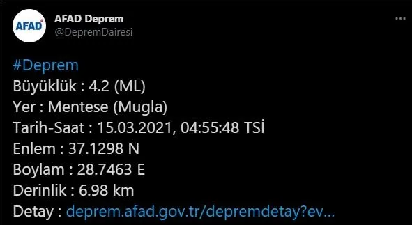 Gelen son dakika haberine göre, Muğla'nın Menteşe ilçesinde 4,2 büyüklüğünde deprem meydana geldi. Afet ve Acil Durum Yönetimi Başkanlığının (AFAD) sosyal medya hesabı Twitter'den yaptığı paylaşımda depremin 6,98 kilometre derinlikte olduğu belirlendi.