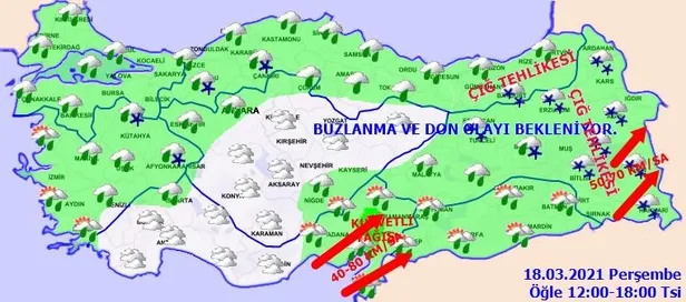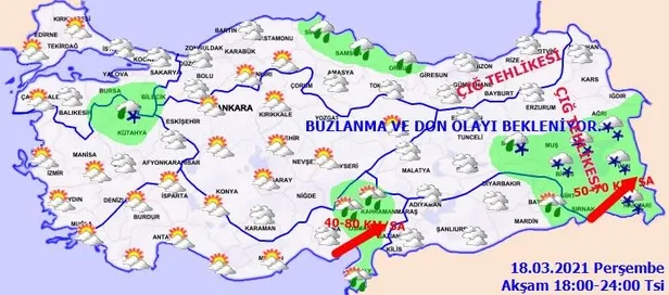 Meteoroloji Genel Müdürlüğünden yapılan son tahminlere göre, Marmara, Ege, Doğu Akdeniz, Karadeniz, Doğu ve Güneydoğu Anadolu, Isparta, Ankara, Eskişehir, Çankırı, Niğde, Nevşehir ve Kayseri çevreleri ile Antalya’nın doğu kesimlerinin yağışlı geçeceği tahmin ediliyor. Yağışların, genellikle yağmur ve sağanak şeklinde olması beklenirken bazı bölgeler için de karla karışık yağmur ve kar uyarısı geldi. Sabah ve gece saatlerinde iç ve doğu kesimlerde buzlanma ve don olayı beklenirken Doğu Karadeniz’in iç kesimleri ile Doğu Anadolu’nun güneydoğusunda çığ oluşma tehlikesine karşı vatandaşlar uyarıldı. Peki, İstanbul, Ankara ve İzmir'de bugün hava nasıl olacak? İşte il il 18 Mart hava durumu raporu.