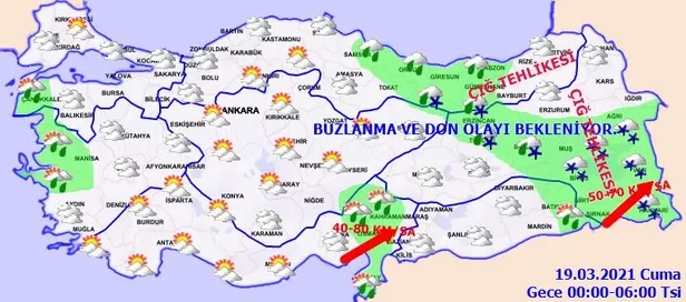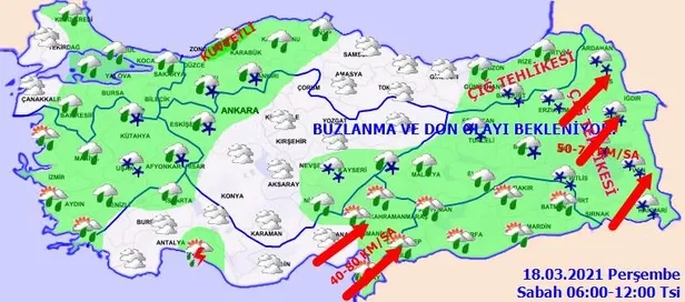 Yağışların; sabah saatlerinde Zonguldak ve Bartın çevrelerinde kuvvetli yağmur, öğle saatlerinden sonra Osmaniye çevreleri ile Kahramanmaraş'ın güney kesimlerinde kuvvetli sağanak ve gök gürültülü sağanak şeklinde olacağı tahmin ediliyor. Sabah ve gece saatlerinde iç ve doğu kesimlerde buzlanma ve don olayı bekleniyor. Doğu Karadeniz'in iç kesimleri ile Doğu Anadolu'nun güneydoğusunda çığ oluşma tehlikesi bulunmaktadır.