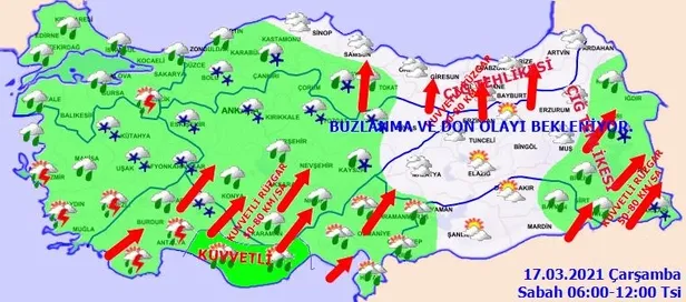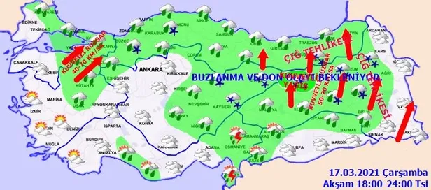 Meteoroloji Genel Müdürlüğü tarafından yapılan son değerlendirmelere göre: Ülkemiz genelinin çok bulutlu, Şanlıurfa dışında kalan bütün bölgelerimizin aralıklı yağışlı geçeceği tahmin ediliyor. Yağışların; genellikle yağmur ve sağanak, Kıyı Ege, Akdeniz, İç Anadolu'nun güney ve doğusunda yer yer gök gürültülü sağanak, Batı Akdeniz'in iç ve yüksek kesimleri (Toroslar Mevkii), İç Ege, İç Anadolu'nun kuzey ve doğusu, Batı ve Doğu Karadeniz'in iç kesimleri ile Doğu Anadolu'nun kuzey ve doğusunda karla karışık yağmur ve kar şeklinde olması bekleniyor. Yağışların Orta ve Doğu Akdeniz'de kuvvetli sağanak (21-50 kg/m2), Akdeniz'in 1200 m üzeri rakımlı yerleri (Toroslar mevki) ile Erzincan ve Tunceli çevrelerinde kuvvetli ve yer yer yoğun kar (20 cm üzeri) şeklinde olması bekleniyor.
