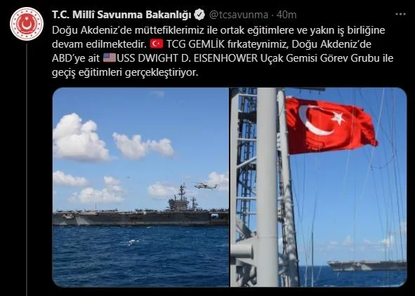 Milli Savunma Bakanlığı, TCG Gemlik fırkateyninin, Doğu Akdeniz'de ABD'ye ait uçak gemisi görev grubu ile geçiş eğitimleri gerçekleştirdiğini duyurdu.