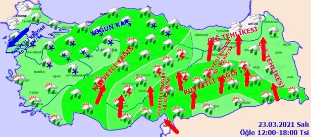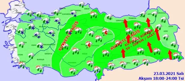 Ülkemizin kuzeybatı kesimlerinde kuzeydoğulu, diğer yerlerde güney ve güneybatı yönlerden orta kuvvette, Marmara'nın güneybatısında kuvvetli(40-70 km/sa), Akdeniz, Doğu Karadeniz, Doğu Anadolu ile Güneydoğu Anadolu'nun doğusunda çok kuvvetli ve fırtına (60-100 km/sa) şeklinde esmesi bekleniyor