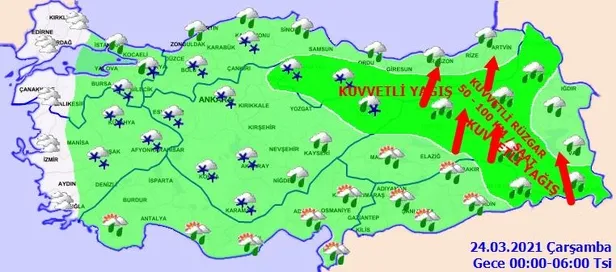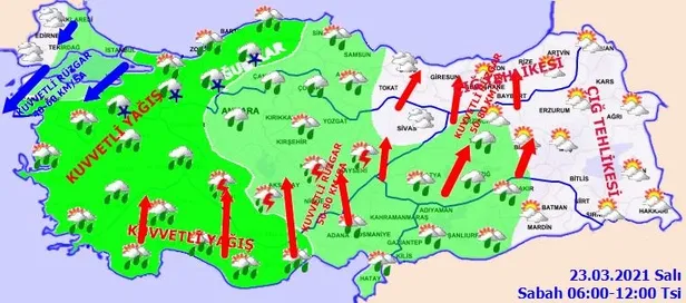 Meteoroloji Genel Müdürlüğü tarafından yapılan son değerlendirmelere göre, ülkemiz genelinin çok bulutlu ve aralıklı yağışlı geçeceği tahmin ediliyor. Yağışların; yağmur ve sağanak, Akdeniz ile iç ve doğu bölgelerde yer yer gök gürültülü sağanak, zamanla Marmara'nın güneydoğusu, İç Ege, İç Anadolu'nun kuzey ve batısı ile Batı ve Orta Karadeniz'in iç kesimlerinde karla karışık yağmur ve kar şeklinde olması bekleniyor. Yağışların Marmara'nın güney ve doğusu, Ege, Akdeniz, İç Anadolu, Batı ve Orta Karadeniz, Doğu Karadeniz'in iç kesimleri, Doğu Anadolu'nun kuzey ve batısı ile Güneydoğu Anadolu'nun kuzeyinde kuvvetli, Doğu Anadolu'nun güneyi, Antalya'nın iç kesimleri ile Kahramanmaraş çevrelerinde yer yer şiddetli yağış şeklinde olacağı tahmin ediliyor.