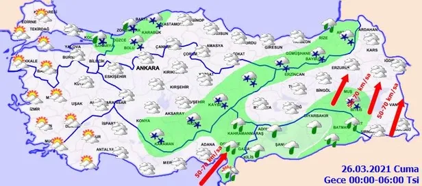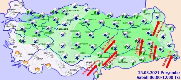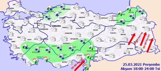 RÜZGAR: Rüzgarın; ülkemizin batısında kuzey ve kuzeydoğu, doğusunda güney ve güneybatı yönlerden orta kuvvette, Doğu Akdeniz, Güneydoğu Anadolu'nun kuzey ve doğusu ile Doğu Anadolu'nun güney ve batı kesimlerinde kuvvetli ve yer yer fırtına şeklinde (50-80 km/sa) esmesi bekleniyor.