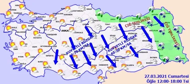 Rüzgarın genellikle kuzeyli, güneydoğu kesimlerde güney ve güneybatı yönlerden hafif, ara sıra orta kuvvette, İç Anadolu, Akdeniz'in iç kesimleri, Doğu Anadolu'nun kuzey ve batısı, Güneydoğu Anadolu'nun kuzeyi ile Doğu Karadeniz'in iç kesimlerinde kuzey ve kuzeybatı yönlerden, Doğu Anadolu'nun güneydoğusunda güney ve güneybatı yönlerden kuvvetli ve yer yer kısa süreli fırtına şeklinde (40-70 Km/sa) eseceği tahmin ediliyor.