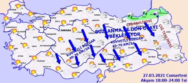 Meteoroloji Genel Müdürlüğü tarafından yapılan son değerlendirmelere göre; ülkemiz genelinin parçalı ve yer yer çok bulutlu, İç Anadolu'nun doğusu, Karadeniz, Doğu Anadolu'nun kuzey ve doğusu ile Ankara, Çankırı, Batman ve Siirt çevrelerinin yağışlı geçeceği tahmin ediliyor. Yağışların; genellikle karla karışık yağmur ve kar, Orta ve Doğu Karadeniz kıyıları ile Diyarbakır, Batman ve Siirt çevrelerinde yağmur şeklinde olması bekleniyor. İç ve doğu kesimlerde buzlanma ve don olayı bekleniyor. Doğu Karadeniz'in iç kesimleri ve Doğu Anadolu'nun doğusunda çığ oluşma riski bulunmaktadır.