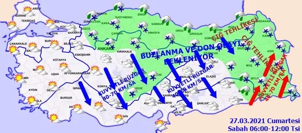 Parçalı ve çok bulutlu, zamanla az bulutlu, bu sabah saatlerinde doğu kesimleri ile Ankara ve Çankırı çevrelerinin aralıklı kar yağışlı geçeceği tahmin ediliyor. Rüzgarın; kuzey ve kuzeybatı yönlerden kuvvetli ve yer yer kısa süreli fırtına şeklinde (40-70 km/sa) esmesi bekleniyor.