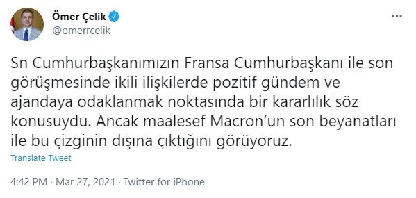 Sayın Cumhurbaşkanımızın Fransa Cumhurbaşkanı ile son görüşmesinde ikili ilişkilerde pozitif gündem ve ajandaya odaklanmak noktasında bir kararlılık söz konusuydu. Ancak maalesef Macron'un son beyanatları ile bu çizginin dışına çıktığını görüyoruz.