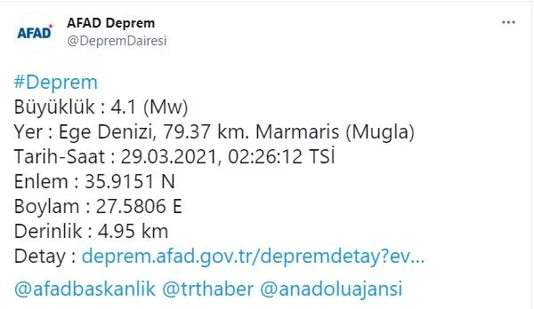 Deniz yüzeyinin 4,95 kilometre derinliğindeki depremin merkez üssünün Muğla'nın Marmaris ilçesine yaklaşık 79 kilometre mesafede olduğu belirlendi