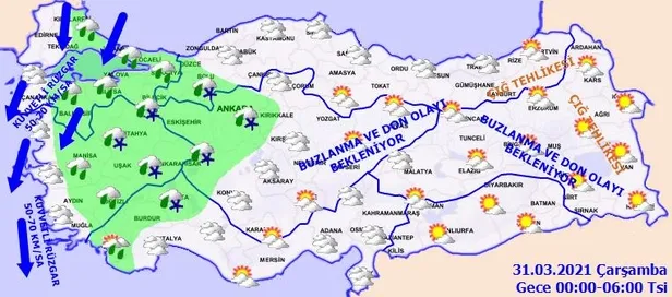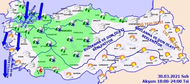 Meteoroloji Genel Müdürlüğü tarafından yapılan son değerlendirmelere göre; ülkemiz genelinin parçalı ve çok bulutlu, Marmara, Kuzey ve İç Ege, Batı Akdeniz, İç Anadolu, Batı ve Orta Karadeniz ile Giresun çevrelerinin yağışlı geçeceği tahmin ediliyor. Yağışların, genellikle yağmur ve sağanak, Batı Akdeniz kıyılarında yer yer gök gürültülü sağanak, İç Ege, Göller Yöresi, İç Anadolu ile Batı Karadeniz'in iç kesimlerinde karla karışık yağmur ve yükseklerinde yer yer kar şeklinde olması bekleniyor. İç ve doğu kesimlerde buzlanma ve don olayı bekleniyor.