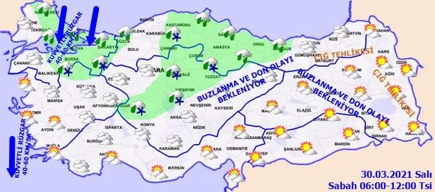 Meteoroloji Genel Müdürlüğünden hava durumuyla ilgili son dakika uyarıları gelmeye devam ediyor. Yapılan son değerlendirmelere göre, ülkemiz genelinin parçalı ve çok bulutlu, Marmara, Kuzey ve İç Ege, Batı Akdeniz, İç Anadolu, Batı ve Orta Karadeniz ile Giresun çevrelerinin yağışlı geçeceği tahmin ediliyor. Doğu Karadeniz'in iç kesimleri ile Doğu Anadolu'nun doğusunda yüksek kar örtüsü olan dik yamaçlarda çığ oluşma riskine karşı vatandaşlar uyarıldı. Öte yandan rüzgarın, Marmara ile Kıyı Ege’de kuzey yönlerden kuvvetli ve yer yer kısa süreli fırtına şeklinde esmesi beklendiğinden yaşanabilecek olumsuzluklara karşı dikkatli ve tedbirli olunması gerektiği bildirildi. İşte il il 30 Mart hava durumu raporu.