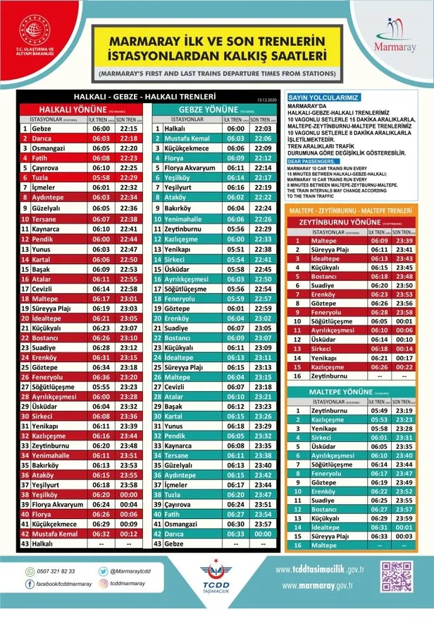 Sayın Yolcularımız, Marmaray trenlerimiz Gebze-Halkalı-Gebze arasında 10 vagonlu setlerle 15 dakika aralıklarla, Maltepe-Zeytinburnu-Maltepe trenlerimiz 10 vagonlu setlerle 8 dakika aralıklarla çalışacaktır.