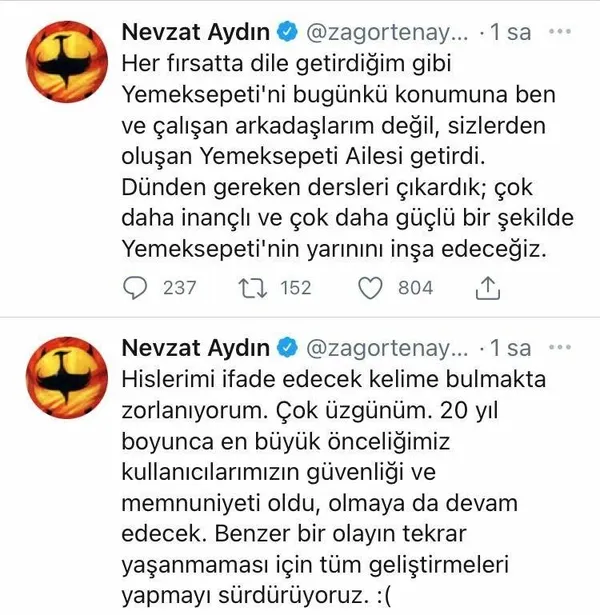 "Peki, Yemeksepeti'nin Twitter'ı çok kullanan, insanlarla polemiklere girmeye zaman ayıran Nevzat Aydın'dan neden hiç ses çıkmıyor? Böyle kriz mi yönetilir? Üç maymunu oynayarak tarihimizin en büyük veri hırsızlığının unutulacağını mı sanıyor?"