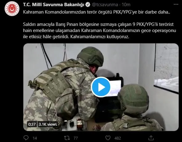 Saldırı amacıyla Barış Pınarı bölgesine sızmaya çalışan 9 PKK/YPG'li terörist hain emellerine ulaşamadan Kahraman Komandolarımızın gece operasyonu ile etkisiz hâle getirildi. Kahramanlarımızı kutluyoruz." ifadelerine yer verildi.