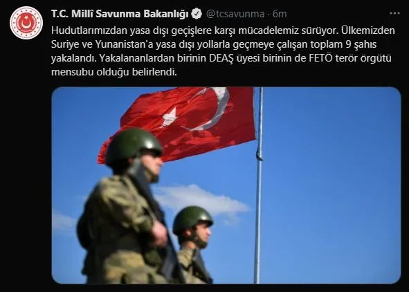 MSB'nin resmi sosyal medya hesabından yapılan açıklamada, "Hudutlarımızdan yasa dışı geçişlere karşı mücadelemiz sürüyor. Ülkemizden Suriye ve Yunanistan'a yasa dışı yollarla geçmeye çalışan toplam 9 şahıs yakalandı. Yakalananlardan birinin DEAŞ üyesi birinin de FETÖ terör örgütü mensubu olduğu belirlendi." ifadelerine yer verildi.