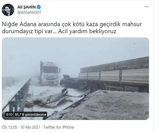 Kaza sonrası sosyal medya üzerinden paylaşım yapan Ali Şahin, "Çok kötü kaza geçirdik. Mahsur durumdayız. Tipi var, acil yardım bekliyoruz" ifadelerini kullandı.