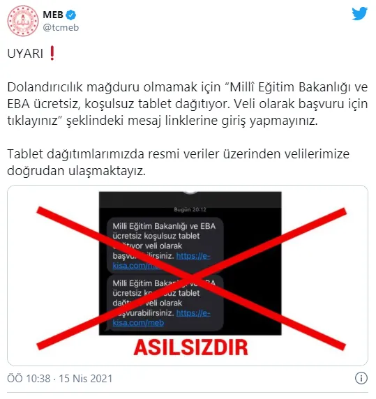 Dolandırıcılık mağduru olmamak için "Millî Eğitim Bakanlığı ve EBA ücretsiz, koşulsuz tablet dağıtıyor. Veli olarak başvuru için tıklayınız" şeklindeki mesaj linklerine giriş yapmayınız.