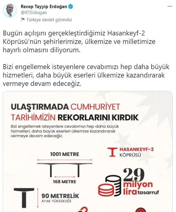 Başkan Erdoğan yaptığı konuşmaya ilişkin Twitter üzerinden de paylaşımda bulundu. Erdoğan, "Bugün açılışını gerçekleştirdiğimiz Hasankeyf-2 Köprüsü'nün şehirlerimize, ülkemize ve milletimize hayırlı olmasını diliyorum. Bizi engellemek isteyenlere cevabımızı hep daha büyük hizmetleri, daha büyük eserleri ülkemize kazandırarak vermeye devam edeceğiz." ifadelerini kullandı.