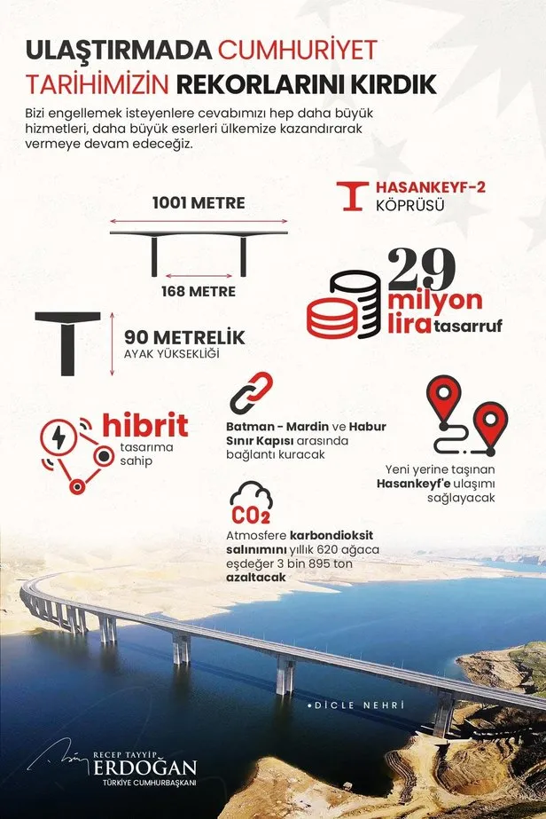 Türkiye'nin en uzun köprüleri arasında yer alacak Hasankeyf-2 Köprüsü'nde çalışmalar tamamlandı ve açılışı Başkan Erdoğan'ın katıldığı törenle gerçekleşti.