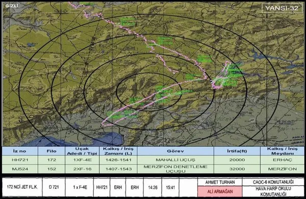 Olay günü helikopterin uçuş güzergâhında iki savaş uçağı, 21 bin feet yükseklikte "tek kol" adı verilen üst üste uçuş yapmıştı. İçinde FETÖ'cü albay Ali Armağan'ın bulunduğu F4 savaş uçağı bu yükseklikte radar kayıtlarında görünmüş, helikopterin düşüş zamanı aralığı olan saat 15.03'te hızla alçalarak radardan çıktıktan sonra, saat 15.07 gibi tekrar yükselerek radar görüntüsüne girdiği saptanmıştı.