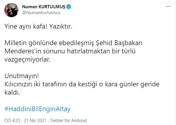 AK Parti Genel Başkanvekili Numan Kurtulmuş da tepki gösterdi. Kurtulmuş, Altay'ın alçak sözlerine ilişkin "Yine aynı kafa! Yazıktır. Milletin gönlünde ebedileşmiş Şehit Başbakan Menderes'in sonunu hatırlatmaktan bir türlü vazgeçmiyorlar. Unutmayın! Kılıcınızın iki tarafının da kestiği o kara günler geride kaldı." dedi.