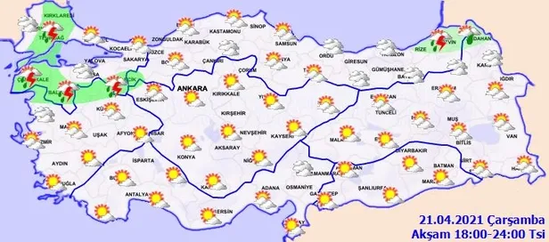 Son dakika haberi! Meteroloji Genel Müdürlüğünden hava durumuyla ilgili uyarılar gelmeye devam ediyor. Yapılan son değerlendirmelere göre, bazı bölgelerde rüzgarın fırtına ve kısa süreli kuvvetli fırtına şeklinde esmesi beklendiğinden meydana gelebilecek ağaç ve direk devrilmesi, çatı uçması, ulaşımda aksamalar ile soba ve baca gazı zehirlenmesi gibi olumsuzluklara karşı dikkatli ve tedbirli olunması gerektiği bildirildi. Peki, bugün İstanbul, Ankara ve İzmir'de hava nasıl olacak? İşte 21 Nisan il il hava durumu raporu.